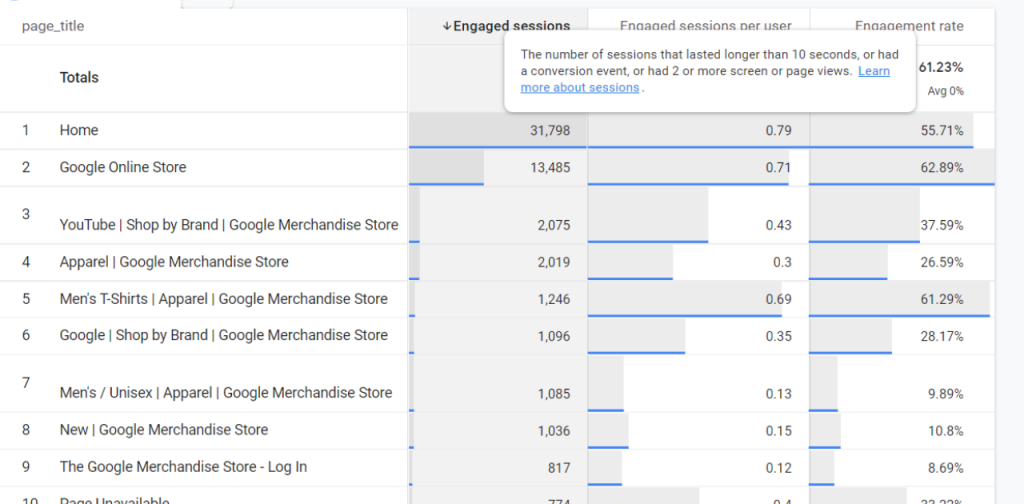 Một Engaged Session được tính là một session có thời lượng từ 10s trở lên, trong session đó người dùng xem ít nhất từ 2 trang đối với website hoặc 2 màn hình đối với ứng dụng di động hoặc có ít nhất một sự kiện chuyển đổi (ví dụ: play video, add product to cart, hoặc purchase).
