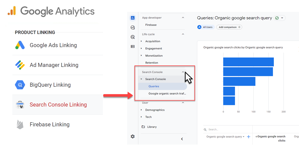 Tích hợp Google Analytics 4 với Search Console cho phép bạn phân tích tìm kiếm tự nhiên (Organic Search) liên quan đến trang web của bạn.