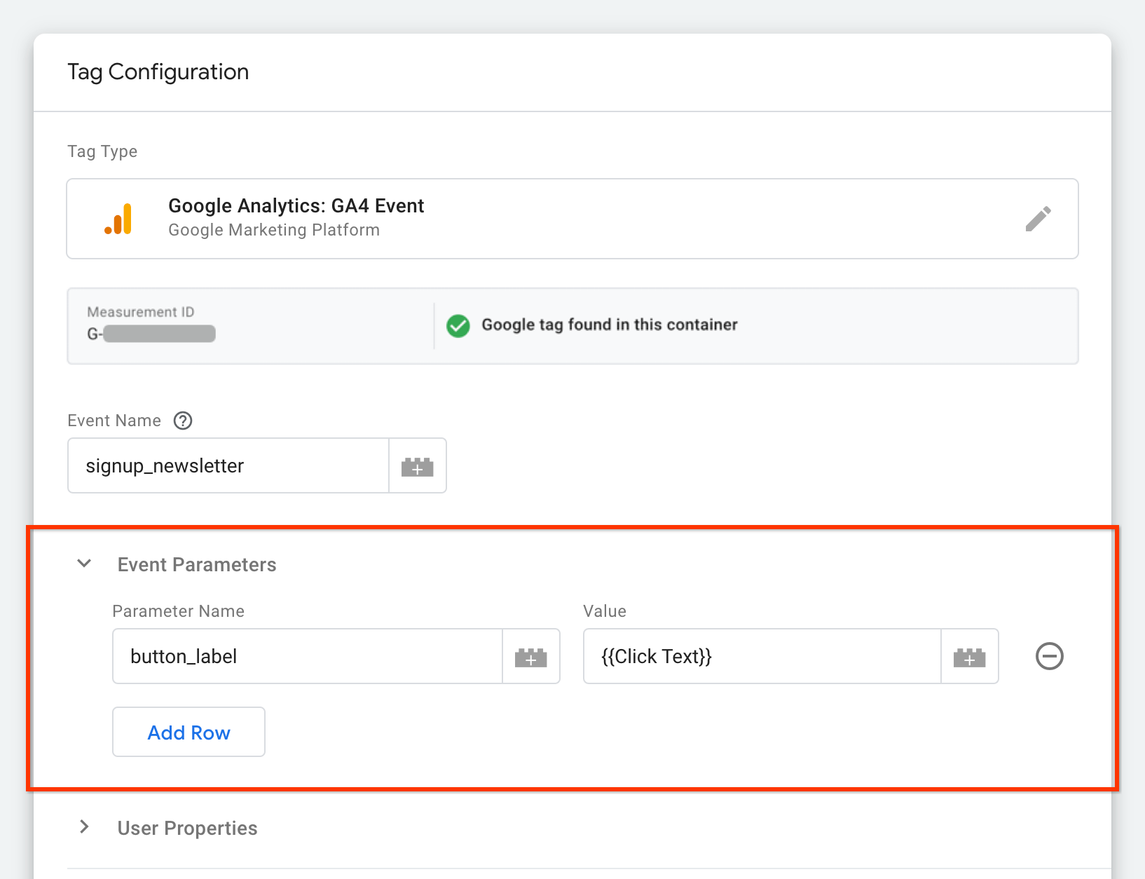 Những bước sau đây hướng dẫn bạn cách thêm thông số vào một sự kiện tuỳ chỉnh có tên là “Bản tin đăng ký” để sự kiện đó bao gồm nhãn của nút mà người dùng đã nhấp vào. Các bước này giả định rằng bạn đã làm theo các bước trong phần Thiết lập sự kiện.
